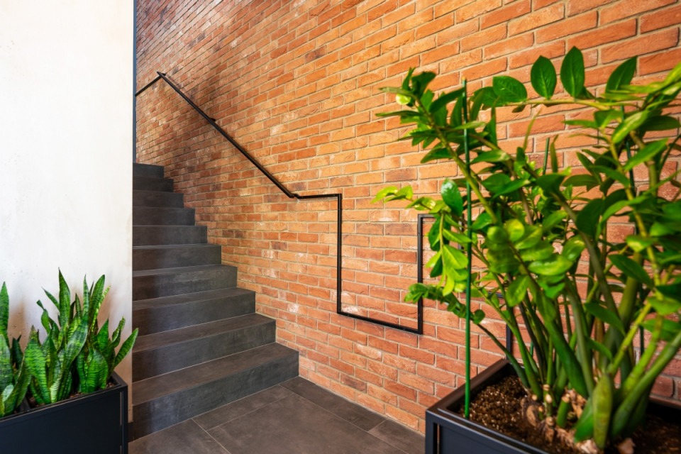 Cegła na klatce schodowej i nieoczywista balustrada.