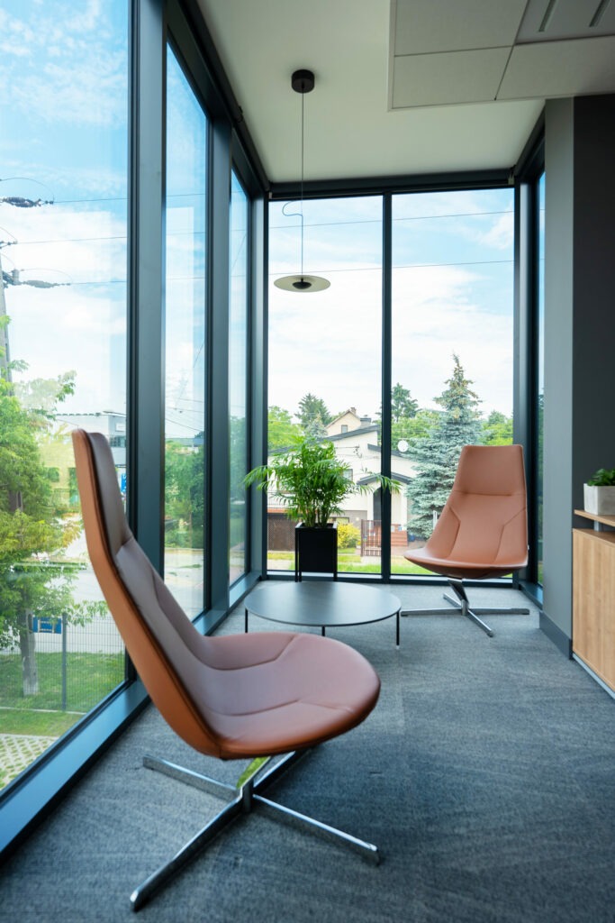Podczas projektowania wnętrza warto wyjść nieco dalej i zastanowić się, w jaki sposób zewnętrzna bryła ma wpływać na to, co zastaniemy po wejściu do siedziby biura. Warto zastanowić się, na ile biuro ma być spójne z otoczeniem i bryłą budynku.