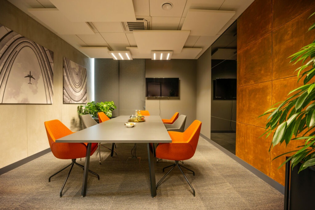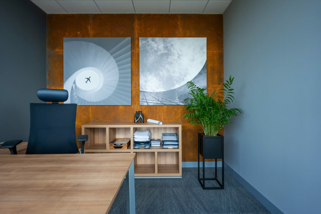 Dodatkowymi elementem, który miał za zadanie wzbogacić wnętrze, stały się wielkoformatowe grafiki. Z jednej strony przedstawiają, przepiękne i mocno geometryczne kadry architektury. Z drugiej, łączą się z niewielkim akcentem ukazującym samoloty. Co najważniejsze, one stały się elementem łączącym, profil działalności Firmy, z miejscem, w którym znajduje się budynek. Cały czas pilnowaliśmy, żeby biuro było spójne z otoczeniem.