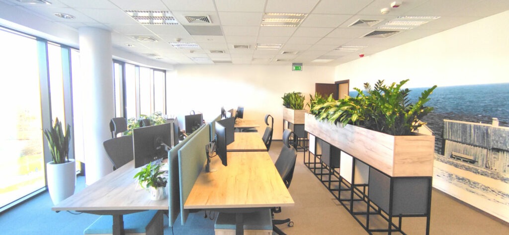 Ogromny wpływ na zdrowie pracowników ma również jakość powietrza. Dlatego zadbaliśmy o rośliny w biurze.  Wiemy, że badania wskazują, że w ich otoczeniu pracownicy są bardziej kreatywni i zrelaksowani. Ponadto, dzięki roślinom możemy łagodzić sytuacje konfliktowe, obniżać stres pracowników. Dodatkowo, zieleń produkuje tlen oraz reguluje wilgotność w pomieszczeniach. W rezultacie, w dużej mierze oczyszcza powietrze z lotnych związków organicznych, produkowanych przez sprzęt elektroniczny oraz jonizuje powietrze.