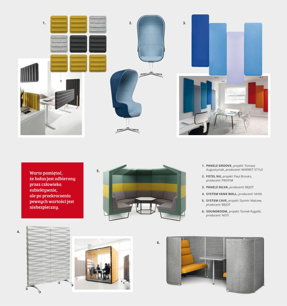 Coraz więcej producentów mebli biurowych zwraca uwagę na rozwiązania dotyczące akustyki wnętrz. W każdej z przestrzeni przybiera ona inny kształt i ma inne zastosowanie. Zaletą takich rozwiązań jest swoboda tworzenia miejsca pracy. Mobilne ścianki wydzielają przestrzeń, która daje poczucie intymności. Dają możliwość zorganizowania w nich zarówno formalnych jak i nieformalnych spotkań (pozycje 5,6). Alternatywą dla budowania pomieszczeń o walorach akustycznych są mobilne box’y przeznaczone zarówno do pracy w skupieniu jak i pracy zespołowej (pozycja 4).Miękkie tapicerowane przegrody pomiędzy pracownikami siedzącymi naprzeciw siebie pochłaniają dźwięk oraz stwarzają możliwość personalizacji miejsca pracy (pozycje 1,3). Do dużych powierzchni typu open space dobrze sprawdzają się rozwiązania typu budki telefoniczne (pozycja 2).