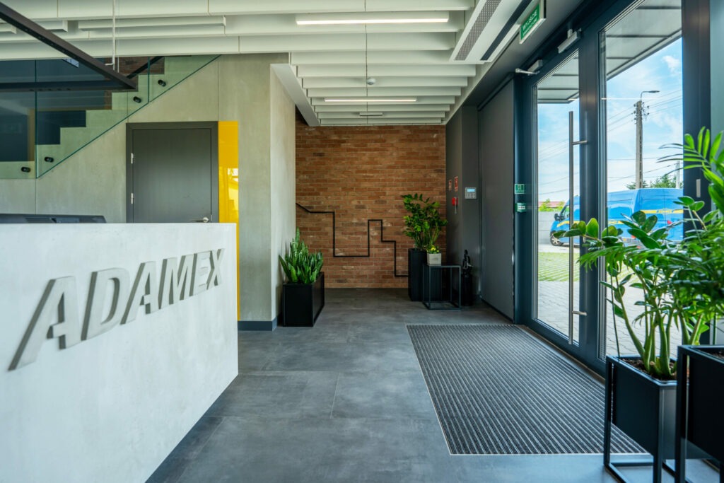Zacznijmy od tego, czym zajmuje się Firma ADAMEX i w jakim miejscu została zaplanowana budowa nowej siedziby. Będzie to istotne i pomoże zrozumieć wszystko to, co powstało we wnętrzu Firmy po kilku miesiącach współpracy.